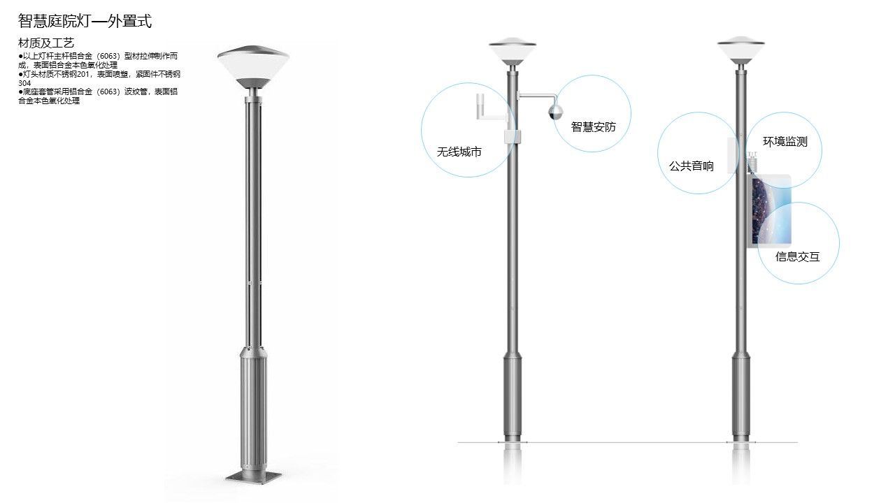 以上灯杆主杆采用铝合金(6063)圆杆整体挤压拉伸制作而成,