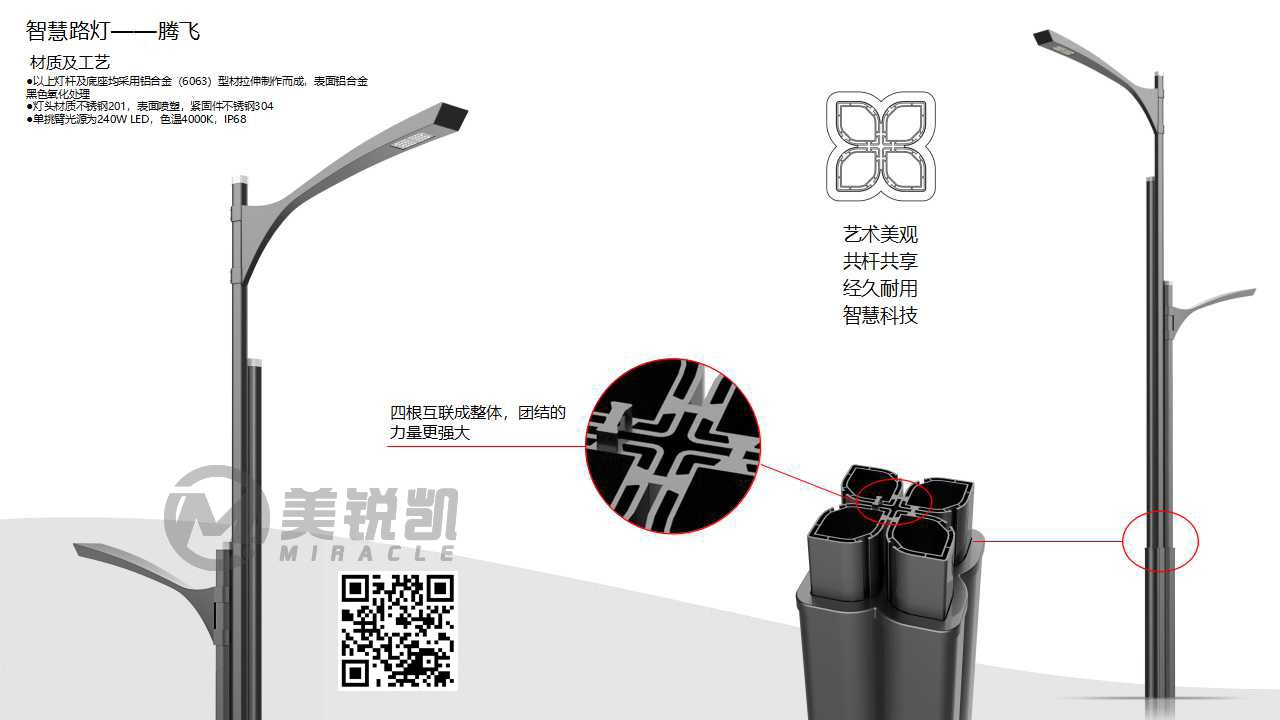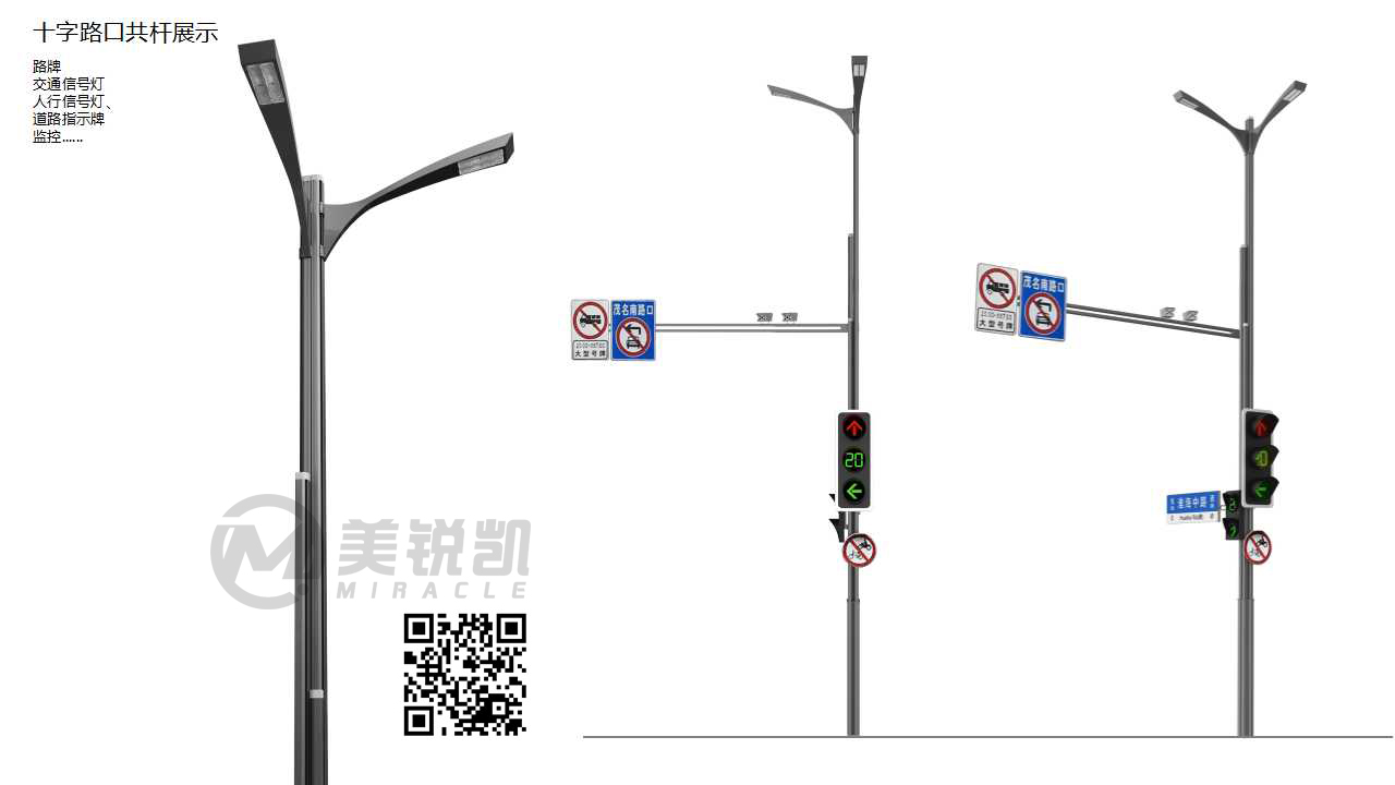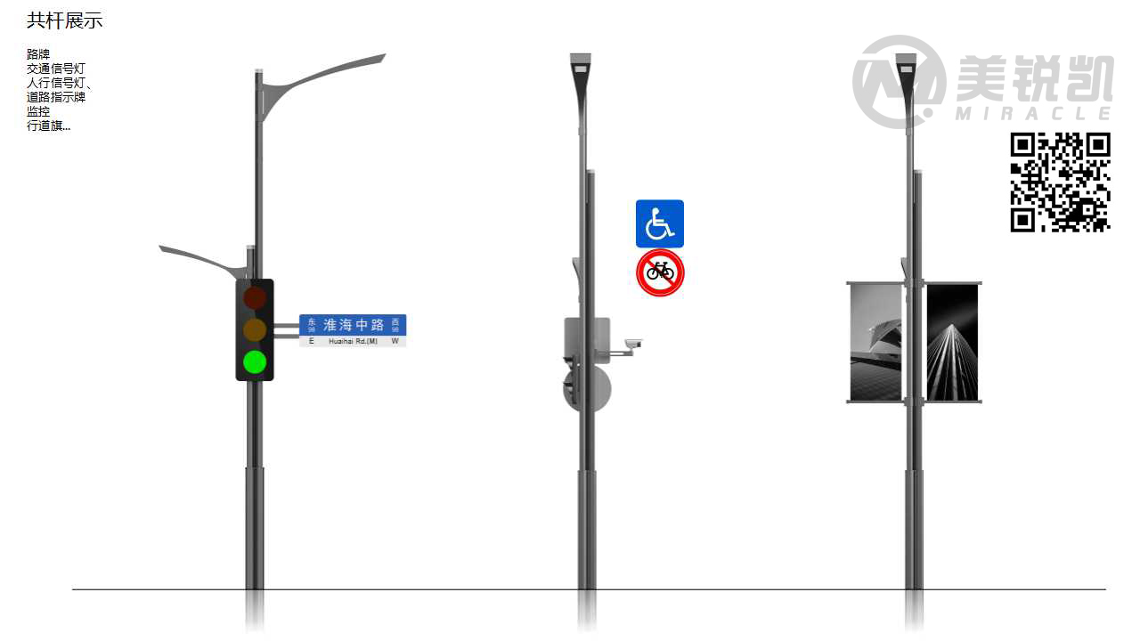 美锐凯智慧灯杆由铝合金异形杆作为主杆,一杆集成路灯照明、城市监控、广告旗、显示屏、交通灯、功放音响、公共WIFI等各种功能,即称共杆系统。