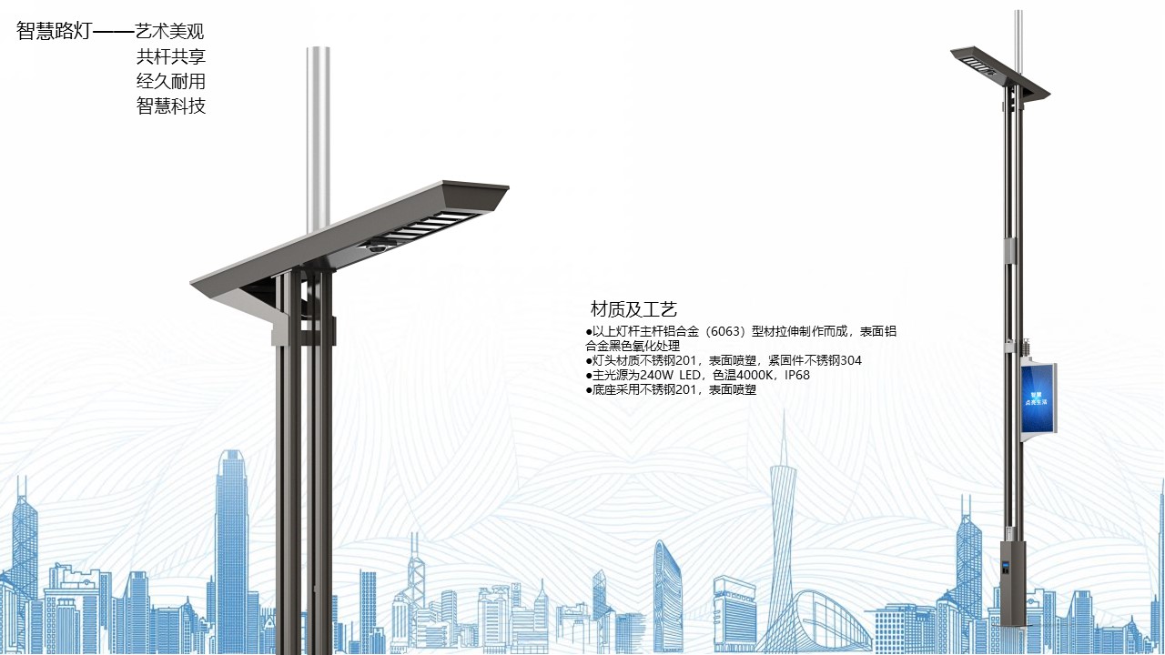 以上灯杆主杆采用铝合金(6063)圆杆整体挤压拉伸制作而成,