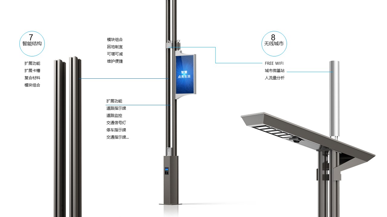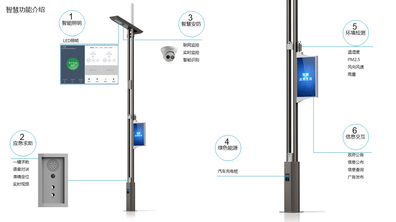 智慧路灯物联系统,以路灯为载体,通过电力线载波或ZigBee通信技术,将路灯智能控制系统与其他功能设备相连接,集照明控制、视频监控、环境检测、公安安防、信息发布、汽车充电、WIFI覆盖等功能与一体,借助于智慧路灯综合管理平台对以上各项功能进行监管,在有效节能的前提下,为创建智慧城市做好铺垫。