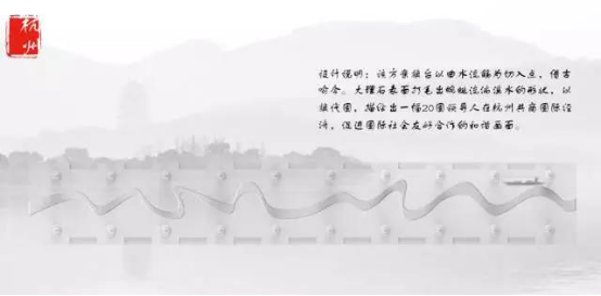 G20峰会在杭州举行,杭州是一个富有历史文化的秀美之地,通过对其地方元素的开发,我们锁定了玉琮文化和杭州的符号代表三潭映月,并添加中国文化元素回型纹,赋予其中国深厚的文化底蕴。
